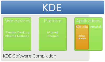 On 24 November 2009 the KDE Marketing Team announced a rebranding of the KDE project components, motivated by the perceived shift from building a desktop environment to a wider ranging project around a community of "people who create software". The rebranding focused on de-emphasizing the desktop environment as "just another product", and emphasizing both the community and the other technologies provided as KDE software. What would have been previously known as KDE 4 was split into three products: Plasma Workspaces, KDE Applications, and KDE Platform – bundled as "KDE Software Compilation 4" (abbreviated "KDE SC 4").[9] As of today the name KDE no longer stands for K Desktop Environment, but for the community that produces the software.[10]