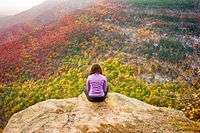 The trail that splits from the snowmobile route a mile from the Platte Clove trailhead curves back another mile or so to Huckleberry Point, a steep and ledgy area which, due to past fires,[9] offers many places to sit back and look down into the clove. Since the route is mostly level, and the roundtrip considerably shorter than that required for the whole mountain, it is popular with those who hike only occasionally. Care must be taken at the Point, however, since some of the ledges also sit above sharp drops.