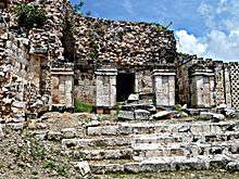The site also has a number of other palaces, low stone buildings, and step-pyramid temples. While most is in the Puuc Maya style, some show Chenes elements. The site had a number of sculpted panels, lintels, and doorjambs, most of which have been removed to museums elsewhere. The sculptures mostly depict the site's rulers and scenes of warfare.
