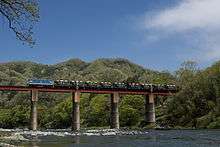 A limestone freight train crosses the Oyahana Viaduct over the Arakawa River near Kami-Nagatoro Station, April 2011