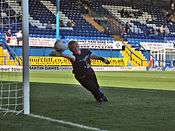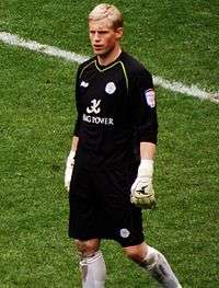 In the first month of the season, Schmeichel was shown a seemingly needless red card in the 79th minute of Leicester's away game to Nottingham Forest on 20 August 2011 after receiving two yellow cards for "unsporting conduct". He received the first card for moving the ball from the penalty spot as Forest's Lewis McGugan was about to take a kick, then received his second for throwing the ball away after the spot kick was successfully converted. After the match, Schmeichel apologized, claiming his back was turned to the referee so did not know he had received the first of the yellow cards. "I didn't know I had been booked as I had my back to the ref otherwise I would never have done that," he said on his personal Twitter page.[54][55] Despite this, Schmeichel's performances for Leicester quickly began earning him plaudits, with his then manager Sven-Göran Eriksson comparing him with England number 1 goalkeeper Joe Hart,[56] and teammate and former England international Paul Konchesky describing him as "one of the best [goalkeepers] he has ever played with".[57] A short-distant reaction save against Portsmouth in November 2011, in particular, earnt Schmeichel praise and was described by Portsmouth manager Michael Appleton as "one of the best saves I have seen in a very long time".[58] and by Leicester manager Nigel Pearson as "a world-class, outstanding save and was very important at that point of the game".[59]