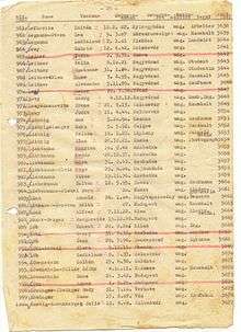 When the train reached Bergen-Belsen on Sunday, 9 July, the passengers were taken to a special section, what would be known as the Ungarnlager (Hungarian camp), where they were held for weeks, and in some cases months. Löb writes that their daily diet consisted of 330 grams of a grey, dense bread, 15 grams of margarine, 25 grams of jam, 1 litre of vegetable (mostly turnip) soup, 1.5 litres of coffee substitute, and sometimes cheese or sausage, with milk and extra rations for children under 14.[24] The group was allowed to organize itself and its activities. As they settled in, the men elected Józef Fischer to be president, and run daily activities.[25] With so many intellectuals among the passengers, there were regular poetry readings, and lectures in history, philosophy and religious education.[26] The living arrangements were primitive, with 130–160 people crammed into each room. Ladislaus Löb describes a typical night, based on a diary kept by Szidonia Devecseri, another passenger: