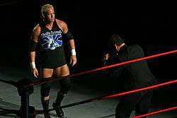 At the OVW tapings on May 10, Kennedy returned to in-ring action facing the Heavyweight Champion, CM Punk, in a title match that Kennedy was unable to win.[5] Kennedy made his return to SmackDown! on the June 9 episode with a victory over Scotty 2 Hotty after using the Kenton Bomb.[23] On the July 14 episode of SmackDown!, Matt Hardy used a roll-up to defeat Kennedy, ending Kennedy's streak of never being defeated by pin or submission.[24] On the July 21 episode of SmackDown!, Batista put out an open challenge to find an opponent for The Great American Bash, as his original opponent, Mark Henry, had been injured.[25] Kennedy accepted the challenge and won the match by disqualification, however, he suffered a severe injury during the match after being thrown headfirst into the steel steps, resulting in an exposed cranium laceration which required twenty stitches to close.[26] He then entered into a short feud with Batista, defeating him by countout in their second match, but losing via pinfall in the third.[5] Kennedy helped The McMahons (Vince and Shane) in their feud with D-Generation X (DX), appearing at both SummerSlam and the August 28 episode of Raw to attack DX.[27][28]