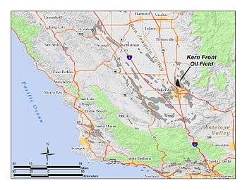 The Kern Front Oil Field is a large oil and gas field in the lower Sierra Nevada foothills in Kern County, California. Discovered in 1912, and with a cumulative production of around 210 million barrels (33,000,000 m3) of oil, it ranks 29th in size in the state, and is believed to retain approximately ten percent of its original oil (approximately 22 million barrels), according to the official estimates of the California Department of Oil, Gas, and Geothermal Resources (DOGGR).[1] It is adjacent to the much larger Kern River Oil Field, which is to the southeast, and the Mount Poso Oil Field to the north.