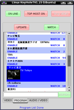 KeyHoleTV is an online television portal that links to Japanese television channels, radio stations, and user-made channels. However, KeyHoleTV only has a very limited selection of channels, such as TV Asahi, NHK, Fuji TV, TBS, TV Tokyo, and Nippon TV. Most are analog and some of the applied channels are password protected. However it does have the US Military's AM radio station in Japan AFN Tokyo Eagle 810