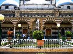 The present-day mosque was built in the early 20th century,[5][11] although some sources claim it dates to the late 19th century.[12][13] Nazim Hussein Pasha, the Ottoman governor of Syria between 1895 and 1909, during the reign of Sultan Abd al-Hamid II,[5][13] ordered the demolition of the Mamluk-era mosque for renovation.[5] The renovation was completed in 1912,[5][8] after Hussein Pasha's term as governor ended. Thus, the current Khalid ibn al-Walid Mosque is of relatively recent construction and is noted for its Ottoman architectural style.[5][8][11][13] According to historian David Nicolle, the mosque's construction by the Ottoman government was an attempt to maintain the allegiance of the increasingly restive Arab inhabitants of Syria. In later years Khalid was adopted as a hero and symbol of Arab nationalism.[12]