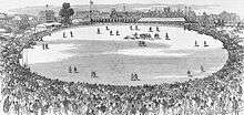 In Melbourne, football was often played in public parks, most notably the Richmond Paddock (Yarra Park), known colloquially as the Melbourne Foootball Ground.[40] Wills argued that cricket fields would benefit from being trampled upon by footballers in winter,[41] and as early as 1859, football was allowed on the MCG.[42] However, cricket authorities frequently denied football on their grounds until the 1870s, when they saw an opportunity to capitalise on the sport's growing popularity. Football quickly adapted to an oval-shaped field, and most grounds in Victoria expanded to accommodate the dual purpose—a situation that continues to this day.[42]