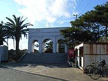 Kimigahama Station opened on 21 June 1931.[1] The original western-style station building fell into disrepair in the post-war years, and was eventually demolished, leaving just the platform.[2] In December 1990, a white Italian-style archway was added, but this was partially demolished in February 2007, leaving just the bare pillars.[3]