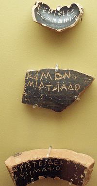 Pieces of broken pottery (Ostracon) as voting tokens for ostracism. The persons nominated are Pericles, Cimon and Aristides, each with his patronymic (top to bottom).