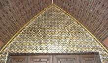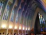 Prof. Hermann Sandkuhl (German) created sgraffiti, displaying different figures in the intermediate spaces between the pilasters, all lost in the fire in 1943.[8] The tympanon of the last, somewhat smaller girder, opening towards the oriented quire, showed a painting of the Sermon on the Mount, depicting Jesus of Nazareth with a corona of light by Erich Waske (German), which was also lost in 1943.[8] The prayer hall is illuminated by three long windows in the quire. The original windows were blasted away by the bombs. In 1962 Sigmund Hahn designed a new central quire window. In the course of the renovation of 1990/1991 Achim Freyer (German) added a new right and left colourful quire window.[9] Höger's Baptismal font of clinker brick with gold paintings on it survived. Regina Roskoden's abstract basalt sculpture of an angel, graphics by Max Pechstein and a painting of the crucifixion by Hermann Krauth are shown in a by-room. Considerable offertories of the parishioners enabled to buy a new organ of 60 registers by E. Kemper & Sohn, installed after 1965 and requiring the removal of the second western loft gallery of seats.[8]