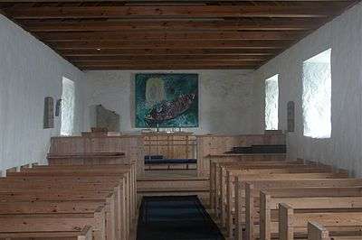 The stone can be seen at the back left of the Saint Olav's church in Kirkjubøur.