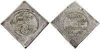 A klippe is a square coin minted on more easily produced square flans either using round or square dies. These coins were originally issued under unfavourable conditions, such as a city under siege. Such emergency coinage were issued in Vienna in 1529, while the city was besieged by the troops of the Ottoman Empire. However, by the seventeenth century, klippe were also commonly produced as presentation pieces. As well, some klippe coins were made as a regular strikes, such as the many variations of the city of Salzburg in Austria, where klippe coins were made in silver and gold for many centuries.
