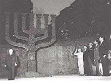 Yosef Sprinzak, the presiding officer in the Knesset, gave a long speech at that ceremony, and among the things said: "... With affection and gratitude, we receive the Menorah... We are excited by the handsome gift... We receive this Menorah as a gift from the Zionist Britain, who saw throughout the times various noble spirits and ideas, Britons who were the forerunners of the rebirth of Israel and encouragers..."[4]