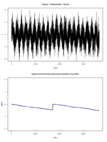 The KZA algorithm has all of the typical advantages of a nonparametric approach; it does not require any specific model of the time series under investigation. It searches for sudden changes over a low frequency signal of any nature covered by heavy noise. KZA shows very high sensitivity for break detection, even with a very low signal-to-noise ratio; the accuracy of the detection of the time of the break is also very high.