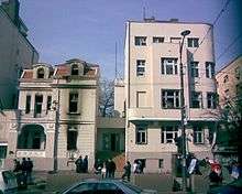 The protest was peaceful until participants arrived at the US, Slovenian and Croatian embassies, where a group of about 1000 rioters[15] separated themselves and started attacking the embassies. They burned the US embassy, entered and destroyed the interior and exterior of the Slovenian embassy[16] and caused minor damage to the Croatian embassy.[17] The security cameras in the Slovenian embassy also filmed the action outside the embassy where Serbian police didn't try to stop the protesters from entering the embassy, instead they moved away, which caused protests in Slovenia.[18] Emergency services were able to put the fire out in embassies after protesters dissipated.[19] At around 21:00 UTC, American news service CNN reported that "charred remains" of an individual had been found inside the burnt-out offices. Flags of United States, Croatia, Slovenia and European Union were also burnt.[20][21] In response, a group of around fifty Croatian protesters burnt the Serbian flag in central Zagreb, after which the police arrested 44 of them.[22] Police guarded the U.S. Embassy in Belgrade on February 22.[23] [24] Other foreign embassies damaged in the course of the protest included those of Belgium, Germany and Turkey.[25][26] In Belgrade and Novi Sad, McDonald's shops were damaged by protestors.[27] According to Serbian sources, the violent protestors were ad hoc football fans. 54 policemen and 34 citizens were injured. A Dutch journalist suffered broken ribs.[28] Serbian politicians condemned the violence.[29] The total damage from the violence was estimated at over 8 million Serbian dinars ($US 143,000).[30] The United Nations Security Council responded to these incidents by issuing a unanimous statement that, "The members of the Security Council condemn in the strongest terms the mob attacks against embassies in Belgrade, which have resulted in damage to embassy premises and have endangered diplomatic personnel," noting that the 1961 Vienna Convention requires host states to protect embassies.[31] In response to the attacks, the German embassy announced that it would temporarily stop granting visas to Serbian citizens.[26] Also on February 21, Serbian army reservists from Kuršumlija took their protest into Kosovo, during which time they attacked the Kosovo Police Service with stones.[32] An explosive was set off in the Kosovo Serb enclave of Kosovska Mitrovica near a United Nations-run courthouse.[33] During the rally there were people who carried portraits of ICTY-fugitive former Bosnian Serb leader Radovan Karadžić and the blue-red flag of the far-right Orthodox organization Obraz.[34] In Kraljevo, Obraz was responsible for the vandalization of an Evangelical church.[30] In Valjevo, a Slovenian firm Sava Osiguranje was set on fire, most likely by protesting youths.[35] The Radio Television of Serbia took American films and sitcoms off the air, replacing them with content from Spain and Russia, who have been against Kosovo's independence.[36]