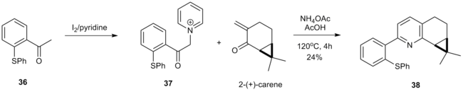 The Kröhnke methodology has also been utilized to generate a number of interesting metal-binding ligands since polypyridyl complexes such as bipyridine (bipy) have been used extensively as ligands. The Kröhnke synthesis was used to prepare a family of tetrahydroquinoline-based N, S-type ligands.[17] 2-thiophenylacetophenone (36) was reacted with iodine gas and pyridine in quantitative yield to generate acylmethylpyridinium iodide 37. Reaction with a chiral cyclic α, β-unsaturated ketone derived from 2-(+)-carene yielded the desired N, S-type ligand 38.