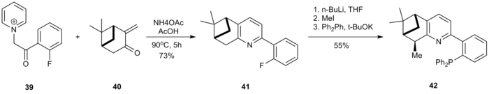 Novel, chiral P, N-ligands have been prepared using the Kröhnke method.[18] α-pyridinium acyl ketone salt 39 was cyclized with pinocarvone derivative 40 to generate pyridine 41. The benzylic position of 41 was methylated and subsequent SnAr reaction with potassium diphenylphosphide to generate ligand 42.