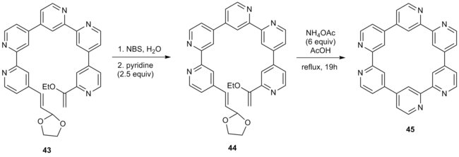The Kröhnke reaction has also enjoyed applicability to the synthesis of a number of biologically active compounds in addition to ones cataloged in combinatorial studies. Kelly and co-workers developed a route to cyclo-2,2′:4′,4′′:2′′,2′′′:4′′′,4′′′′:2′′′′,2′′′′′:4′′′′′,4-sexipyridine utilizing the Kröhnke reactions as the key macrocyclization step.[19] Polypyridine complex 43 was treated with N-Bromosuccinimide in wet tetrahydrofuran followed by pyridine to generate the acylmethylpyridinium salt 44 which can then undergo the macrocyclization under standard conditions to yield the desired product 45. The Kröhnke method in this synthesis was crucial due to the failure of other cyclization techniques such as the Glaser coupling or Ullmann coupling.