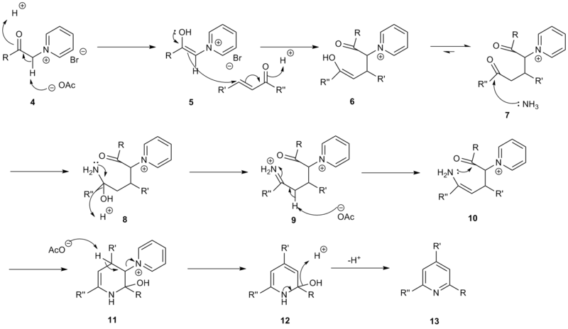 The mechanism of the Kröhnke pyridine synthesis begins with enolization of α-pyridinium methyl ketone 4 followed by 1,4-addition to the α, β-unsaturated ketone 5 to form the Michael adduct 6, which immediately tautomerizes to the 1,5-dicarbonyl 7. Addition of ammonia to 7 followed by dehydration via 8 generates the imine intermediate 9.,[3][4] The imine intermediate is then deprotonated to enamine 10 and cyclizes with the carbonyl to generate intermediate 11. The pyridinium cation is then eliminated to form hydroxy-dienamine 12. Aromatization of 12 via subsequent loss of water generates the desired pyridine heterocycle 13.