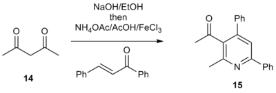 1,3-dicarbonyl compounds have also been shown to be viable starting materials in place of the α-pyridinium methyl ketone salts.[7] For example, treatment of 1,3-diketone 14 with base in ethanol followed by ammonium acetate, acetic acid, the corresponding enone and a Lewis acid yields 3-acyltriarylpyridines of the form 15. These acyl pyridine are attractive intermediates because they have an electrophilic handle that allows for additional functionality to be incorporated into the molecule. This allows for straightforward construction of complex polyaryl systems, an attractive method for library synthesis of drug targets containing functionalized pyridine moieties.