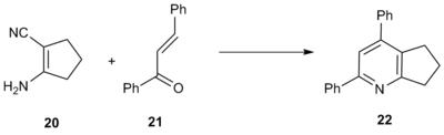 In 1992, Robinson and co-workers developed a similar pyridine synthesis using enamino nitriles as one of the three-carbon fragments in place of an α-pyridinium methyl ketone.[13] This improvement increases the reactivity of the system and allows for formation of fully substituted pyridines whereas use of an α-pyridinium methyl ketone requires that the 3- or 5- position on the resulting pyridine be unsubstituted. Kröhnke condensation of enamino nitrile 20 with enone 21 yielded fused pyridine 22.