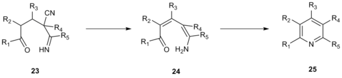 The mechanism of this Kröhnke-type reaction likely proceeds via a vinylogous cyanamide 23 which undergoes elimination of hydrocyanic acid, deprotonation to form enamine 24 and cyclization to form intermediate 25, which is then dehydrated to from the desired pyridine product.
