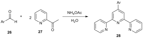 A clean one-pot Kröhnke method in aqueous media generates 4’-aryl-2,2’:6’, 2’’-terpyridines.[14] Reaction of aryl aldehyde 26 with two equivalents of 2-acetylpyridine (27) yielded terpyridines of the form 28.