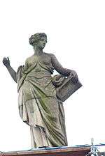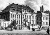 The building was then renovated and refurnished in Neoclassical style (with furniture from Prussia rather than France) and became the residence of Crown Prince Frederick William (the future Frederick William III) and his wife Louise, who lived there with their children and Countess Voss, who had an apartment near the entrance.[3][4] They remained there after he became king and the Palace was now called Königliches Palais (Royal Palace).[5] Johann Gottfried Schadow created his double statue of Crown Princess Louise and her sister Frederica, the Prinzessinnengruppe, in the palace in 1795–97. The future Emperor William I was born there on 22 March 1797.[6] In the early 19th century, Karl Friedrich Schinkel renovated several rooms in the palace; he also designed an extension over the Oberwallstraße connecting the palace to the Kronprinzessinnenpalais (Crown Princesses' Palace), where the king's three daughters were living; this was built in 1811 by Heinrich Gentz in association with his remodelling of the exterior of the Prinzessinenpalais.[7] After Louise's early death, Frederick William maintained a family shrine to her in the palace.[8] The main building was known as the Königliches Palais (Royal Palace) until 1840; after 1840, when the king died, it was known as the former Royal Palace, and was not used by any members of the royal family; during the reign of Frederick William IV, it housed court officials, and Rudolf Lepke, who founded a major auction house, grew up there.[9]