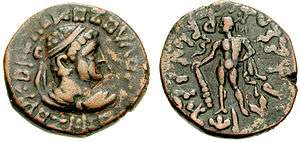 The origins of Kujula Kadphises are quite obscure, and it is usually considered he was a descendant of the Kushan ruler Heraios, or even identical with him.[1] Interestingly however, Kujula shares his name (Kushan: Κοζουλου on some of his "Hermaeus" coins, or Κοζολα on his "Augustus" coins) with some of the last Indo-Scythian rulers, such as Liaka Kusulaka (Greek: Λιακα Κοζουλο), or his son Patika Kusulaka, which might suggest some family connection.[2]