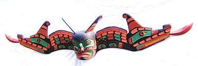 Of particular importance in Kwakwaka'wakw culture is the secret society called Hamatsa. During the winter, there is a four-day, complex dance that serves to initiate new members of Hamatsa. The Hamatsa dancer represents the spirit of Baxbaxwalanuksiwe ("Man-Eater at the North End of the World"[1]); who can transform into various man-eating birds and has mouths all over his body. Hamatsa initiates are possessed by Baxwbakwalanuksiwe'. On the first day of the Hamatsa ceremonies the initiate is lured out of the woods and brought into the Big House to be tamed. When the initiate returns, he enacts his cannibalistic possession symbolically. Gwaxwgwakwalanuksiwe' is the most prestigious role in the Supernatural Man-Eater Birds ceremony; he is a man-eating raven. Galuxwadzuwus ("Crooked-Beak of Heaven") and Huxhukw (supernatural Crane-Like Bird who cracks skulls of men to suck out their brains) are other participants.