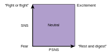 Lövheim also proposed that the sympathetic and parasympathetic parts of the autonomic nervous system might be viewed as orthogonal axes, instead of viewing them as antagonists. The sympathetic axis were thought to represent arousal and the parasympathetic axis to represent secretion and possible positive versus negative valence.[6] This model corresponds, in a way, to the cube model of emotions (the sympathetic axis appears to be similar to the noradrenergic axis, and the parasympathetic axis to the serotonergic axis in the CNS).