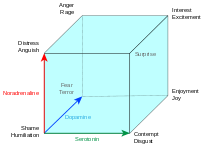 Lövheim cube of emotion[1][2] is a proposed theoretical model aiming at explaining the relationship between the monoamine neurotransmitters and the emotions. The model was proposed in a paper of 2012 by Hugo Lövheim.[3] In the model, the three monoamine neurotransmitters serotonin, dopamine and noradrenaline form the axes of a coordinate system, and the eight basic emotions, labeled according to the affect theory of Silvan Tomkins, are placed in the eight corners. The origin corresponds to a situation where all three signal substance are low. The eight corners of the cube correspond to the eight possible combinations of low or high level of the three monoamines as shown in the table below. The model hence proposes a direct relation between specific combinations of the levels of the signal substances and certain basic emotions.[4]