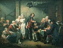L'Accordée de Village is a painting by the French artist Jean-Baptiste Greuze, first exhibited at the 1761 Salon, where it was unanimously praised by the critics, notably by Diderot. It was the first example of the 'moral painting' genre, to which Greuze often returned. It is now in the Louvre Museum in Paris.