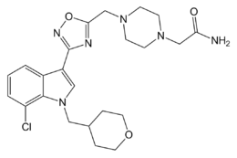 - ↑ Ratcliffe P, Adam JM, Baker J, Bursi R, Campbell R, Clark JK, Cottney JE, Deehan M, Easson AM, Ecker D, Edwards D, Epemolu O, Evans L, Fields R, Francis S, Harradine P, Jeremiah F, Kiyoi T, McArthur D, Morrison A, Passier P, Pick J, Schnabel PG, Schulz J, Steinbrede H, Walker G, Westwood P, Wishart G, de Haes JU. Design, synthesis and structure-activity relationships of (indo-3-yl) heterocyclic derivatives as agonists of the CB1 receptor. Discovery of a clinical candidate. Bioorganic and Medicinal Chemistry Letters. 2011 Apr 15;21(8):2541-6. PMID 21411321