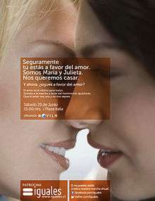 Public opinion has shown substantial support for same-sex civil unions: 65% favored their legalization in 2004, even though only 24% supported same-sex marriage.[46] In 2009, 33.2% supported same-sex marriage and 26.5% supported adoption by same-sex couples.[47] Support among young people is much higher: according to a study by the National Youth Institute of Chile, 56% of young respondents supported same-sex marriage, while 51.3% supported same-sex adoption.[48] An August 2012 poll found that 54.9% of Chileans support same-sex marriage, while 40.7% are opposed.[49] A more recent poll showed that 70% of youths support same-sex marriage.[50] On the 7th of September 2015, a poll found that 60% of Chileans support marriage between same-sex couples, while 44% support same-sex adoption.[51]