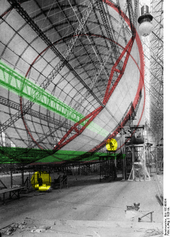 Built at the Zeppelin Company works (Luftschiffbau Zeppelin) in Friedrichshafen am Bodensee (Lake Constance), Germany, between 1926 and 1928, the LZ-127 had a design patterned on that of the LZ-126, which the company had delivered as a war reparation to the U.S. Navy. The LZ-126 had been delivered at NAS Lakehurst, New Jersey, in October 1924, where it was commissioned as the USS Los Angeles (ZR-3).[2] With that project completed, the Zeppelin company's chairman Dr. Hugo Eckener promptly began a two-year campaign of lobbying the German Government for funds and permission to proceed with construction of a new airship for Germany.[3] Construction began in 1926 with the aid of a government grant although the majority of the necessary 2 million Reichsmarks (RM) in funding would eventually be raised by public subscription.[4] The LZ 127 was completed and launched in September 1928.