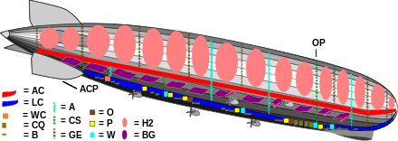 At 236.6 m (776 ft) and a total gas volume of 105,000 m3 (3,700,000 cu ft) of which 75,000 m3 (2,600,000 cu ft) was hydrogen carried in 17 "lift gas" cells (Traggaszelle) and 30,000 m3 (1,100,000 cu ft) was Blau gas in 12 "power gas" cells (Kraftgaszelle), the Graf was the largest airship in the world at the time. It was powered by five Maybach VL-2 12-cylinder 550 hp engines that could burn either Blau gas or gasoline.[5]