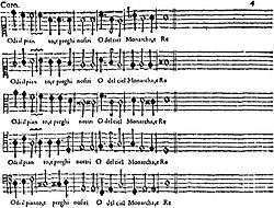 The text is 445 lines in total. While short, it offers heightened emotions and dramatic opportunities, including the eight stanza chorus that celebrates the nymph's flight from Apollo’s attack called, ‘Bella ninfa fugitive.’[8] Typical of composition techniques at the birth of Italian opera, Gagliano set Rinuccini’s text of Dafne with homophonic choruses intertwined with intermittent choral polyphony. His homophonic choruses, though lacking in a unified textual theme, did provide textual clarity, highlighting the importance of comprehensible singing, especially when setting moral text. This is typified in the opening scene of Dafne through a five-part chorus of the text “Hear our plaint and prayer, O Monarch and King of Heaven.” The chorus is a prominent figure throughout the composition, at times adding to the action of the story and at other times, providing reflective commentary.