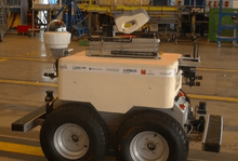 In industrial robotics, LAAS-CNRS participates to the French project Air-Cobot. Picture of the robot in an hangar of Air France Industries.