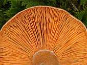 The dense, bow-like lamellae are pale-orange to pale-ochre and on the stipe basifixed or slightly decurrent. They are brittle and intermixed with shorter lamellulae (short gills that do not extend fully from the cap margin to the stem) as well as partly forking near the stem. In old age or in cases of injury they receive initially dark red, later grey green spots. The spore print is pale ochre.[7][11]