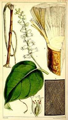 - "What is most strange in this Tree is, that the inward bark is made up of about twelve Coats, Layers, or Tunicles, appearing white and solid, which if cut off for some Length, clear'd of its outward Cuticula, or Bark, and extended by the Fingers, the Filaments or Threads thereof leaving some rhomboidal Interstices, greater or smaller according to the Dimensions you extend it to, form a Web not unlike Gause, Lace, or thin Muslin."[13]