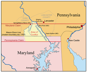 Pennsylvania had a longstanding dispute with Maryland about the southern border of the province and Lancaster County. Nine years of armed clashes accompanied the Maryland-Pennsylvania boundary dispute, which began soon after the 1730 establishment of Wright's Ferry across the Susquehanna River. Lord Baltimore believed that his grant[19] to Maryland extended to the 40th parallel.[20] This was about halfway between present-day Lancaster and the town of Willow Street, Pennsylvania. This line of demarcation would have resulted in Philadelphia's being included in Maryland.