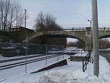 The Landing Masonry Bridge, also designated Bridge 44.53, is a 136-foot (41 m) stone structure built in 1907 by the Delaware, Lackawanna and Western Railroad in Landing, New Jersey, United States. Located 44.53 miles up the rail line from Hoboken Terminal, the bridge carries the two-lane Morris County Route 631 (Landing Road) over the Morristown Line and Montclair-Boonton Line railroad tracks maintained by New Jersey Transit, and sits several hundred feet north of NJT's Lake Hopatcong Station. Now deteriorated and structurally deficient, it is to be replaced with a four-lane bridge by NJT and the New Jersey Department of Transportation.[3]