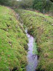 Two separate bleach works are marked on the Ordnance Survey maps and areas of open ground are indicated which would have been the bleachfields. Ample supplies of water were available from the Cadgerford Burn and the Disk Water that run through the area. Supplies of lye made from ash tree ashes would have been plentiful in this well wooded district. In 1828 the 'Bleachfield' is recorded with two buildings in different areas that are probably the bleach works. The largest bleach works lay next to a millpond fed by the Cadgerford Burn that supplied water for both the 'bucking' process and power for the waterwheel.[13] Dye works buildings lay close by with a path marked that also ran to the other bleach works site that lay next to the Dusk Water with a wooden bridge over the watercourse.[15] By 1895 both bleach works and the dye house are shown as ruins on the OS maps[16] which links with the discovery of Chlorine on the late 18th century after which Bleach works and the associated bleachfields became redundant.