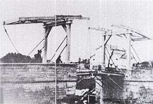The Langlois Bridge was one of the crossings over the Arles to Bouc canal.[6] It was built in the first half of the 19th century to expand the network of canals to the Mediterranean Sea. Locks and bridges were built, too, to manage water and road traffic. Just outside Arles, the first bridge was the officially titled "Pont de Réginel" but better known by the keeper's name as "Pont de Langlois".[7][8] In 1930, the original drawbridge was replaced by a reinforced concrete structure which, in 1944, was blown up by the retreating Germans who destroyed all the other bridges along the canal except for the one at Fos-sur-Mer, a port on the Mediterranean Sea. The Fos Bridge was dismantled in 1959 with a view to relocating it on the site of the Langlois Bridge but as a result of structural difficulties, it was finally reassembled at Montcalde Lock several kilometers away from the original site.[9][10]