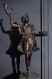 In households of modest means, small Lar statuettes were set in wall-niches, sometimes merely a tile-support projecting from a painted background. In wealthier households, they tend to be found in servant's quarters and working areas.[29] At Pompeii, the Lares and lararium of the sophisticated, unpretentious and artistically restrained House of Menander[30] were associated with its servant quarters and adjacent agricultural estate. Its statuary was unsophisticated, "rustic" and probably of ancient type or make. The placing of Lares in the public or semi-public parts of a house, such as its atrium, enrolled them in the more outward, theatrical functions of household religion.[31]