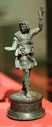 Archaic Rome's Etruscan neighbours practiced domestic, ancestral or family cults very similar to those offered by later Romans to their Lares.[1] The word itself seems to derive from the Etruscan lar, lars, or larth, meaning "lord".[2][3] Ancient Greek and Roman authors offer "heroes" and "daimones" as translations of "Lares"; the early Roman playwright Plautus (c. 254–184 BC) employs a Lar Familiaris as a guardian of treasure on behalf of a family, as a plot equivalent to the Greek playwright Menander's use of a heroon (as an ancestral hero-shrine).[4] Weinstock proposes a more ancient equivalence of Lar and Greek hero, based on his gloss of a 4th-century BC Latin dedication to the Roman ancestor-hero Aeneas as Lare (Lar).[5]