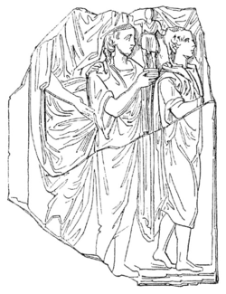 From the Late Republican and early Imperial eras, the priestly records of the Arval Brethren and the speculative commentaries of a very small number of literate Romans attest to a Mother of the Lares (Mater Larum). Her children are invoked by the obscure, fragmentary opening to the Arval Hymn (Carmen Arvale); enos Lases iuvate ("Help us, Lares").[57] She is named as Mania by Varro (116–27  BC), who believes her an originally Sabine deity. The same name is used by later Roman authors with the general sense of a bogey or "evil spirit".[58] Much later, Macrobius (fl. AD 395–430) describes the woolen figurines hung at crossroad shrines during Compitalia as maniae, supposed as an ingenious substitution for child sacrifices to the Mater Larum, instituted by Rome's last monarch and suppressed by its first consul, L. Junius Brutus.[59] Modern scholarship takes the Arval rites to the Mother of the Lares as typically chthonic, and the goddess herself as a dark or terrible aspect of the earth-mother, Tellus. Ovid supplies or elaborates an origin-myth for the Mater Larum as a once-loquacious nymph, Lara, whose tongue is cut out as punishment for her betrayal of Jupiter's secret amours. Lara thus becomes Muta (the speechless one). Mercury leads her to the underworld abode of the dead (ad Manes); in this place of silence she is Dea Tacita (the silent one). En route, he impregnates her. She gives birth to twin boys as silent or speechless as she. In this context, the Lares can be understood as "manes of silence" (taciti manes).[60][61]
