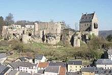 Larochette Castle (Luxembourgish: Buerg Fiels, German: Burg Fels, French: Château de Larochette) stands high above the town of Larochette in central Luxembourg. Dating from the 11th century, the castle was destroyed by fire at the end of the 16th century. Since its acquisition by the State of Luxembourg in 1979, some restoration work has been undertaken.[1]