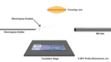 Laser Ablation Electrospray Ionization (LAESI) is an ambient ionization method for mass spectrometry that combines laser ablation from a mid-infrared (mid-IR) laser with a secondary electrospray ionization (ESI) process. The mid-IR laser is used to generate gas phase particles which are then ionized through interactions with charged droplets from the ESI source. LAESI was developed by Professor Akos Vertes and Dr. Peter Nemes in 2007 and is now marketed commercially by Protea Biosciences, Inc. LAESI is a novel ionization source for mass spectrometry (MS) that has been used to perform MS imaging of plants,[1][2][3] tissues,[4][5][6][7] cell pellets,[8] and even single cells.[9][10][11][12] In addition, LAESI has been used to analyze historic documents[13] and untreated biofluids such as urine and blood.[1] The technique of LAESI is performed at atmospheric pressure and therefore overcomes many of the obstacles of traditional MS techniques, including extensive and invasive sample preparation steps and the use of high vacuum. LAESI can be used to perform MS analysis of many different classes of compounds ranging from small molecules, such as pharmaceuticals, saccharides,[1][2][3][9][10] lipids,[5][7] and metabolites[1][2][3][4][5][6][7][8][9][10] to larger biomolecules like peptides[1] and proteins.[1] LAESI has also been shown to have a quantitative dynamic range of 4 decades and a limit of detection (LOD) of 8 fmol with verapamil, a small pharmaceutical molecule.[1] The technique has a lateral resolution of <200 μm for imaging applications[7][14] and has been used for 3D imaging of plant tissues.[3] Additionally, in cell-by-cell LAESI imaging experiments single cells can be used as the pixels of the molecular image.[12] This LAESI application uses etched optical fibers to produce laser spot sizes of <50 µm to deliver the laser energy and has also been utilized in single cell analysis experiments.[9][10][11][12]